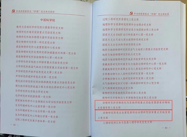 近日,中央和国家机关工委印发《关于命名中央和国家机关“四强”党支部的决定》,命名了一批“政治功能强、支部班子强、党员队伍强、作用发挥强”的先进党支部。动物研究所动物进化与系统学院重点实验室暨国家标本资源库职工党支部、农业虫害鼠害综合治理研究国家重点实验室职工党支部被命名为“中央和国家机关‘四强’党支部”。