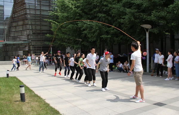 在“背对背拥抱”项目中,每组选手需要背靠背夹住气球进行接力,在规定距离内根据时间长短确定名次,获得积分。在这项活动中,小伙伴们的配合更加默契,速度也有了提升,队友们都相互为各自组加油打气,很快就决定出了名次。”“小球‘筷’跑”是我们的一个全新创意活动,选手们利用筷子传递规定数目的乒乓球,根据所用时间长短进行积分排名。整个过程井然有序,其中部分选手手握乒乓球违规操作,我们进行了提醒,但整体过程进展顺利。“齐越火线”是我们在传统跳大绳项目上做了一些规则改动的创新游戏,每组两名选手摇绳,其余队员跳绳。队员依次进入,计时三分半,在规定时间内按照通过人数进行排名。这个活动体现了各组的团队合作精神,现场一度火爆。大家热情高涨,主持人与大家的现场互动将整个活动推向了高潮。