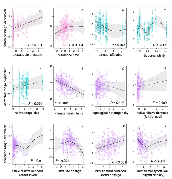 在控制采样偏差、行政区边界、空间和类群等随机效应后,本研究整合物种特征(繁殖力、扩散能力、原产地分布区大小)、入侵事件特征(繁殖体压力、建群后定居时间)和入侵栖息地特征(与原产地之间的气候相异性、地形异质性、科/目水平本土物种丰富度、土地利用变化、陆路/航空运输)三个层面的解释变量构建了广义可加混合效应模型(图3)。模型平均结果发现,入侵分布区扩展与入侵区与原产地间的气候相异性存在显著负相关,而与引种繁殖体压力和入侵区道路密度存在显著正相关,这意味着外来入侵物种在与原产地更加相似气候环境下入侵扩展范围更广(图4)。与此同时,更高的引种繁殖体压力和更为频繁的人为协助扩散能够加剧外来物种的入侵分布区扩展(图4)。