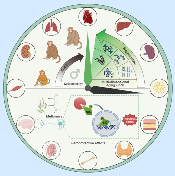 2024年9月12日,中国科学院动物研究所刘光慧研究组、曲静研究组与中国科学院北京基因组研究所张维绮课题组合作,于Cell杂志在线发表了题为“Metformin decelerates aging clock in male monkeys”的研究论文。历经8年的深入探索,研究团队首次发现二甲双胍不仅能够调节血糖,还能促进雄性老年灵长类个体多种组织器官的年轻化。进而,研究团队利用生理机能评估、医学影像、血液检测等60多项生理参数分析,结合多维生命组学和组织病理学技术,证实了二甲双胍对全身11个系统79种组织器官具有全面的衰老保护效果,并能显著提升老年灵长类个体的认知能力,为衰老机制及干预研究开辟了新的研究范式。