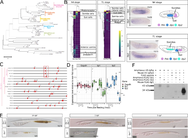 最后,通过系统比较Ilp1、Ilp2及Ilpr基因突变品系后,结果进一步证实了文昌鱼Pdx蛋白并没有直接调控Ilp1和Ilp2基因表达的能力。其中,Pdx表达仅限于成年文昌鱼中肠的特定区域,而文昌鱼Ilp1和Ilp2基因则不在这个区域表达。基因敲除实验表明,Ilp1蛋白在控制幼鱼身体生长方面发挥类似脊椎动物胰岛素样生长因子的功能,而与脊椎动物胰岛素不同,Ilp1和Ilp2基因表达水平对进食的反应较弱。此外,文昌鱼Ilp1多肽能够与文昌鱼Igfbp蛋白产生微弱相互作用,与脊椎动物Igf1和Igfbp蛋白互作的典型特征相似。