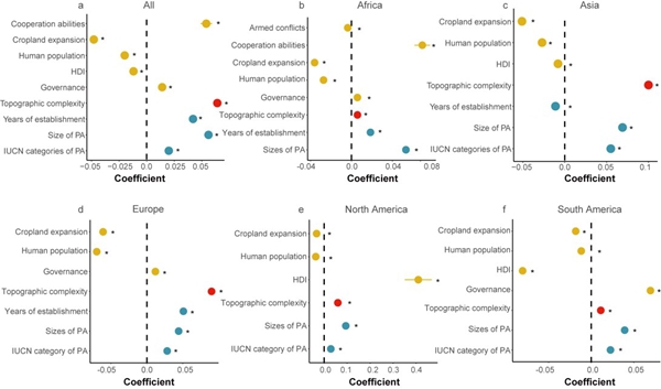 图 4. 全球和各大洲跨境地带野生动物保护率的影响因素