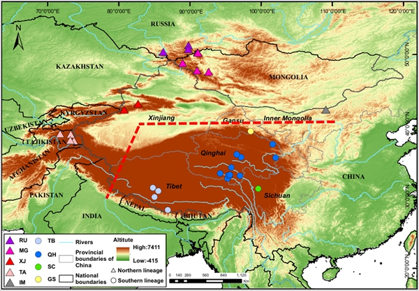 雪豹南部支系主要分布于青藏高原和横断山脉等高海拔地区,而北部支系则主要分布于阿尔泰山、天山、帕米尔高原和喀喇昆仑山等较低海拔地区。自然选择分析发现,南部支系共有552个基因受到正选择作用,这些基因主要富集于HIF-1低氧适应信号通路、血液循环和肥厚性心肌病等相关通路,其中,包括EPAS1、CAMK2B、CAMK2D等7个低氧适应相关基因。进一步分析EPAS1基因发现,该基因存在两个连锁的错义突变(671G/A-Val/Ile 和 804T/C-Cys/Arg),且其内含子变异率显著高于基因组其它基因。这两个连锁突变的衍生等位基因在南部支系中几乎固定(等位基因频率0.969),而在北部支系中的频率较低(0.344);其等位基因频率与海拔分布呈正相关,即海拔越高,衍生等位基因的频率越高。这一结果表明,EPAS1基因可能在雪豹适应高原低氧环境中发挥了重要作用。