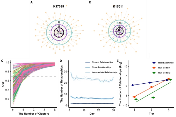 (A) 雄性与 (B) 雌性的自我中心网络示例,内圈表示最亲密伙伴,中圈表示亲密伙伴,外圈表示中等伙伴(方形=雄性,圆形=雌性)。(C) Jenks自然断点算法在303只鸟30天的数据中均稳定识别出四个层级(GVF=0.85,虚线)。(D) 各层级的社会伙伴数量和随时间的变化在个体间高度一致,实线为平均值,虚线为95%置信区间。(E) 不同层级的社会关系数量对数变化(实测数据与两种零模型对比)。点为对数均值,误差棒为95%置信区间。不同层级的社会伙伴数量呈指数增加,显示出分形特征。