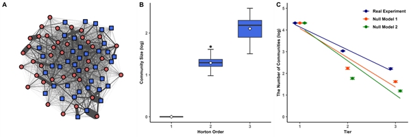 (B) 不同层级(Horton分级)的群体规模分布(箱线图)及其对数均值(菱形)。
