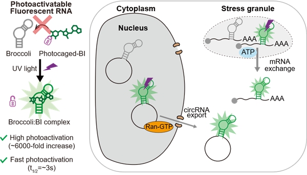 荧光标记技术与显微成像的结合极大推动了生命科学研究的进展。绿色荧光蛋白(GFP)等标签已被广泛用于蛋白质成像,然而其“常亮”特性限制了在亚细胞尺度上对特定分子群体进行精确追踪。为了突破这一局限,研究人员开发出光激活荧光蛋白(如PA-GFP),可在特定光照下选择性“点亮”目标蛋白,从而实现对细胞内局部蛋白动态的高精度研究。相比之下,RNA作为生命活动中不可或缺的核心分子,参与转录调控、核输出和应激响应等关键过程,却长期缺乏具备时空精确性的光控成像工具,这一技术缺口严重制约了对RNA动态行为的深入探索。