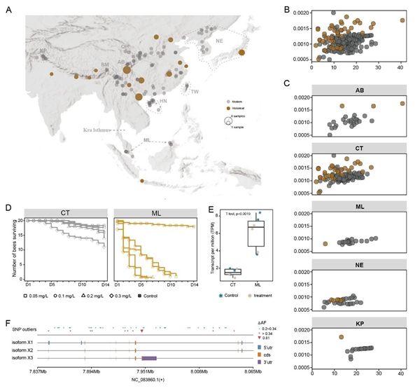 图1:博物馆基因组学揭示的蜜蜂基因组变化。(A)现代与历史蜜蜂样本的地理分布。历史样本的位置以橙色点表示,点的大小表示样本数量。现代样本以灰色点表示。由于历史样本的经纬度信息不可用,其在地图上的位置根据标本标签提供的采集信息,以所在省会或乡镇表示。各群体标记如下:AB(阿坝)、BM(波密)、CT(中部)、HN(海南)、ML(马来西亚)、NE(东北)、KP(克什米尔与巴基斯坦)、QH(青海)、TW(台湾)。(B-C)蜜蜂的遗传多样性(基因组杂合度,Y 轴)与基因组测序深度(X 轴)。B包含所有样本,而C按不同遗传群体进行分类。历史样本和现代样本按照图例颜色区分。 (D) 蜜蜂工蜂在暴露于吡虫啉后的存活情况。(E)nAChR α1 亚型 X3 的基因表达谱。(F)nAChR α1 基因的遗传变异。SNP 位点用三角形表示,对应其在基因中的位置,并用大小显示不同时期的等位基因频率差异。