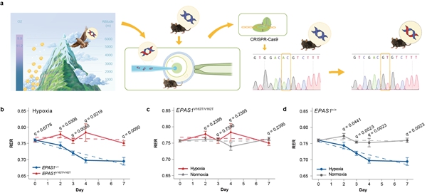 2025年10月24日,中国科学院动物研究所詹祥江实验室在国际综合期刊Nature Communications 杂志在线发表了题为“Homeostasis of glucose and lipid metabolism during physiological responses to a simulated hypoxic high altitude environment”(doi: https://doi.org/10.1038/s41467-025-64110-w)的研究论文。在该研究中,基于在青藏高原猎隼中鉴定的EPAS1基因正选择位点(Pan et al.,Mol. Ecol.),团队运用基因编辑技术首次建立了EPAS1隼型小鼠模型,进而结合转录组、代谢组、功能实验和行为分析,发现隼型小鼠在低氧条件下能够维持糖脂代谢稳态,这主要得益于遗传与行为的共同调节,并使其在急性低氧胁迫下获得更高的存活率。
