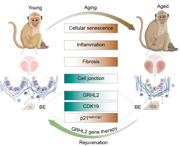 2025年11月20日,中国科学院动物研究所刘光慧研究员、首都医科大学宣武医院王思研究员、中国科学院动物研究所曲静研究员与中国科学院北京基因组研究所张维绮研究员合作,在Nature Aging 上发表了题为“Reprogramming the GRHL2-CDK19 axis by gene therapy alleviates prostate aging”的研究论文。该研究系统解析了灵长类前列腺衰老的关键细胞与分子调控网络,首次揭示基底上皮细胞中GRHL2-CDK19分子轴失活可通过激活p53-p21信号通路,从而驱动前列腺衰老。基于该发现,团队进一步开发了靶向GRHL2的基因治疗策略,在动物模型中成功缓解了前列腺衰老相关表型,完成了从机制解析到干预策略的闭环研究。