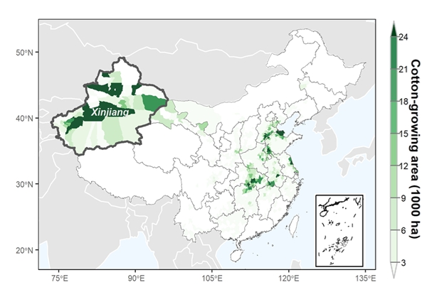 图1.中国县级棉花种植区域分布情况。新疆目前是我国最大的棉花产区。