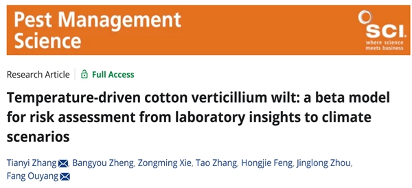 为此,中国科学院动物研究所欧阳芳与中国科学院大气物理研究所张天一研究员,联合新疆农垦科学院、中国科学院新疆生态与地理研究所、中国农科院棉花研究所、新疆气象局及澳大利亚联邦科学与工业研究组织等中外学者,聚焦国家战略经济作物——棉花,针对其“癌症”之称的毁灭性病害黄萎病,在Top专业期刊《Pest Management Science》上连续发表两项重要研究成果。
