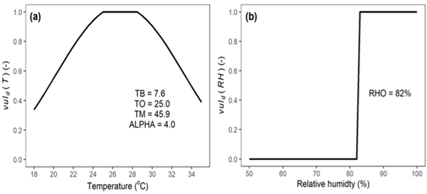 图2. 棉花产量的黄萎病脆弱性对温度和湿度的响应