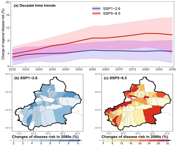 图3. 气候变暖导致的潜在疾病风险变化的模型预测趋势。