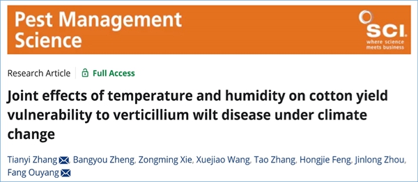 2. Zhang, T.*, Zheng, B., Xie, Z., Wang, X., Zhang, T.,. Feng, H., Zhou, J., Ouyang, F.*. Joint impact of temperature and humidity impacts on cotton yield vulnerability to Verticillium wilt disease under climate change. Pest Management Science. https://doi.org/10.1002/ps.70409