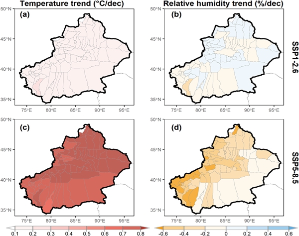 图4. 中国新疆地区各县域在 SSP1-2.6 和 SSP5-8.5 情景的气温和相对湿度变化趋势。