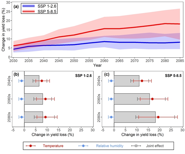 图5. 在气候变化情景下预测的棉花因黄萎病造成的产量损失。