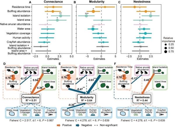基于广义线性混合模型分析,在控制调查/采样年份和不同岛屿间样本伪重复效应以及空间自相关效应后,发现牛蛙入侵种群丰度是导致本土两栖类捕食网络连接度等发生改变的重要影响因子,其中模块化程度受牛蛙入侵的影响最为显著(图3);结构方程模型分析进一步发现,本土两栖类捕食网络模块化随牛蛙入侵种群丰度和牛蛙定殖时间的增加而持续降低(图3)。这一结果表明,伴随牛蛙在舟山群岛入侵时间的增加与种群规模的不断扩大,本土两栖类捕食网络的稳定性不断减弱。