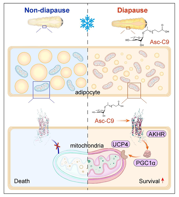 研究团队发现,低温会促使越冬期松墨天牛幼虫大量产生一种蛔甙分子asc-C9。它在体内充当“应激激素信号”,使滞育幼虫在越冬期的存活能力相比非滞育幼虫显著提升。滞育幼虫的线粒体嵴结构更紧密稳定,非滞育幼虫线粒体呈现肿胀、破碎。外源补充asc-C9可通过脂动激素受体AKHR激活PGC-1α–UCP4通路:一方面促进线粒体生成,另一方面启动“解偶联呼吸”,增强线粒体对低温的耐受。PGC-1α–UCP4通路此前主要在哺乳动物中被认为与脂肪褐色化、抗衰老和抗肿瘤相关,本研究首次在昆虫中发现,该通路同样可通过调控脂肪动员参与耐寒适应,揭示了一种跨物种保守的能量调控策略。