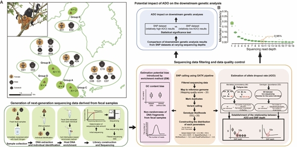 然而,粪便样本本身也存在不少技术挑战。粪便中真正来自动物本身的DNA含量很低(~1%)。在热带雨林高温高湿环境中,DNA容易被降解成细小片段,并混杂食物残渣和微生物等外源DNA。尽管国际上已开发出多种从粪便样本中获取动物基因组数据的技术手段,但受限于粪便样品自身特性,其基因组数据中容出现各种错误。这些错误究竟有多少、对后续遗传分析产生多大影响,业界一直缺乏的系统评估技术,从而长期限制了粪便基因组信息在保护生物学中的应用。