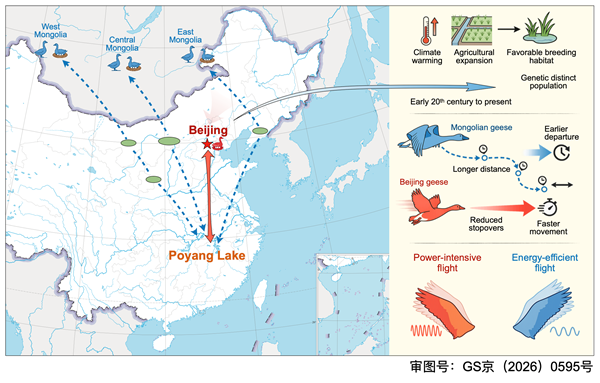 该研究表明,北京地区繁殖的鸿雁种群代表了一个近百年来新形成、遗传上独立的种群,它们不仅建立了新的繁殖地,还在较短时间尺度内形成了不同于其他东亚种群的迁徙路线。更重要的是,研究从机制层面揭示了:快速行为调节及其对应的飞行生物力学变化,可能是新迁徙路线形成的重要基础。这一发现将迁徙路线变化与行为适应、飞行能量学和环境响应直接联系起来,为理解迁徙动物如何应对快速气候变化和人类活动影响提供了新的机制框架,也为东亚迁徙鸟类的保护管理提供了重要科学依据。
