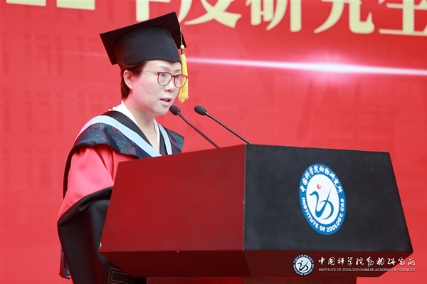 博士生高素伟代表全体毕业生,感谢辛勤培育、指导研究生的导师。她回望漫漫求学路,山高水长,师恩难忘。为实现远大的科研理想和抱负,大家从祖国的五湖四海相聚动物研究所,研究所广场银杏林的四季更替、寒夜书香永远定格在回忆的橱窗。这是一场知行合一的历练,更是一场突破自我的修行,让莘莘学子体会到了青春和成长。她祝福大家带上感恩的心踏上新的征途,散落天涯仍各自发光。