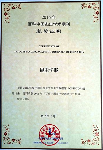 根据10月31日中国科学技术信息研究所最新发布,《昆虫学报》荣获“第4届中国精品科技期刊”和“2016年中国百种杰出学术期刊”荣誉。