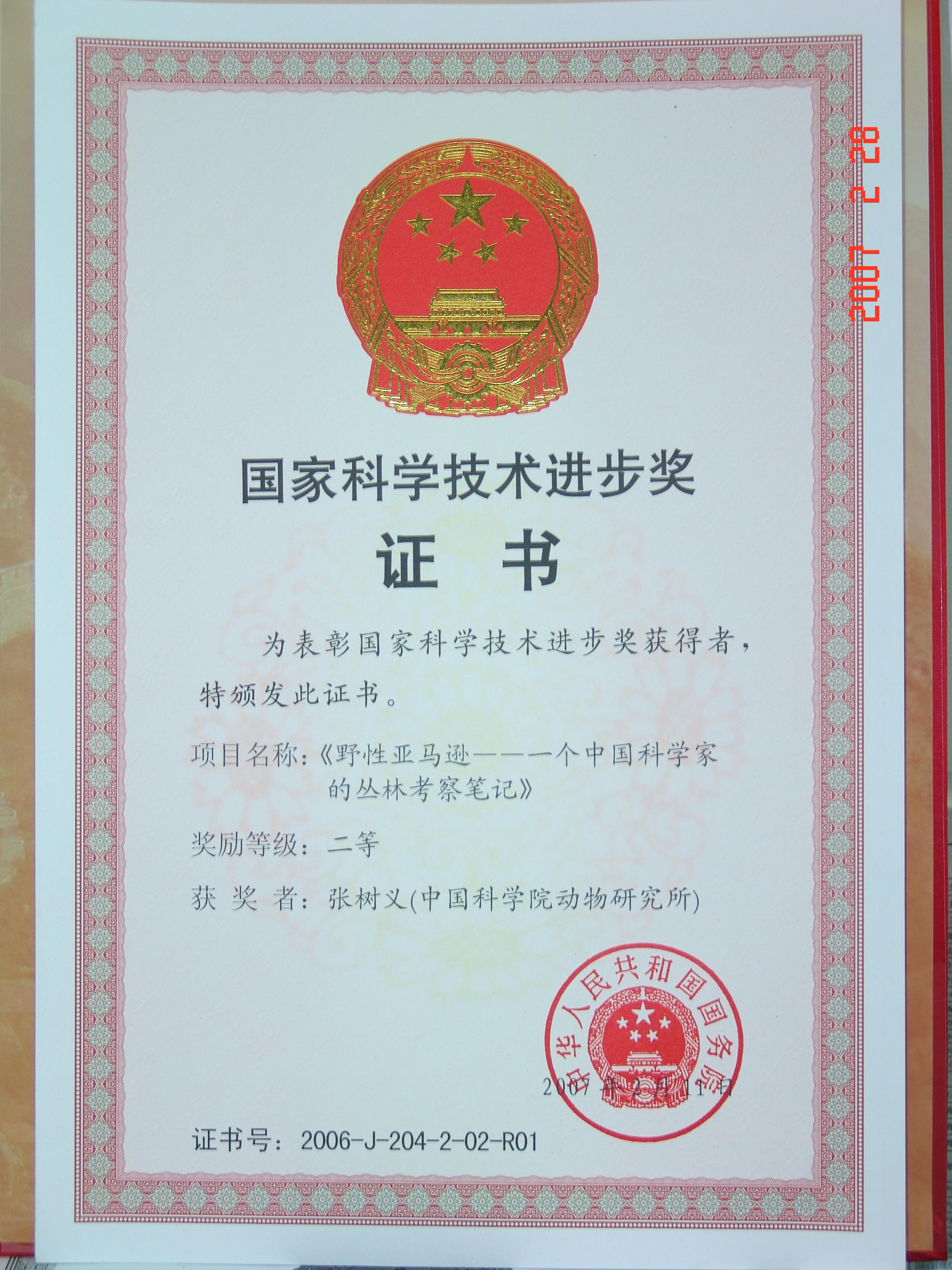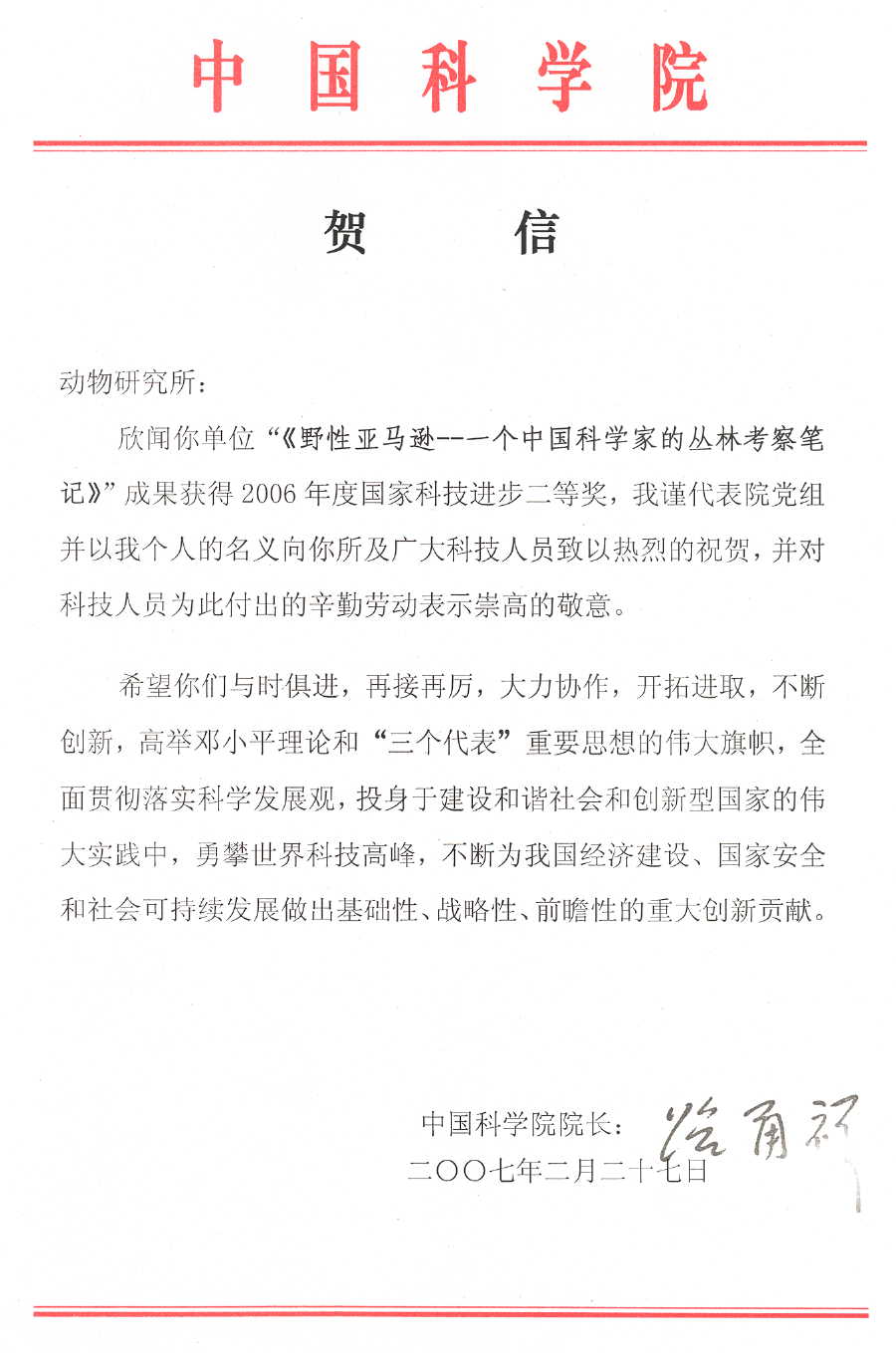 2月27日上午,党中央、国务院在人民大会堂隆重召开2006年度国家科技奖励大会,向获得2006年度国家最高科技奖、自然科学奖、技术发明奖和科技进步奖的获奖个人和单位颁奖。党和国家领导人胡锦涛、温家宝、曾庆红、李长春出席大会并为获奖代表颁奖。温家宝代表党中央、国务院在大会上讲话。李长春主持大会。动物所《野性亚马逊??一个中国科学家的丛林考察笔记》(作者:张树义)获2006年国家科技进步二等奖(科普奖),中国科学院路甬祥院长发来贺信表示热烈祝贺。