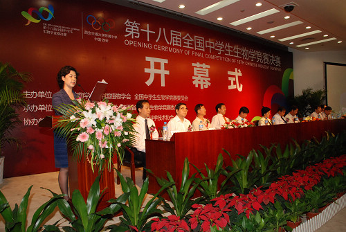 大会在雄壮的国歌声中开幕,西安交通大学党委书记王建华首先致词,他代表西安交通大学对各位来宾、各位老师、各位同学的到来表示热烈的欢迎;西安交通大学附属中学校长王佩东代表承办校致欢迎词;陕西省科学技术协会党组书记牟怀岐、中国科协青少年科技中心副主任蒙星、中国动物学会秘书长、全国中学生生物学竞赛委员会副主任魏辅文分别讲话,西安交通大学附属中学杜逸飞同学代表参赛学生宣誓,表示将遵守竞赛规则,努力拼搏,赛出水平、赛出风格;王健代表评判专家宣誓,表示按照公正、公平原则认真对待每项评判。最后,朱静芝副省长致词并宣布第十八届全国中学生生物学竞赛开赛。