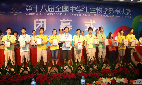 全国中学生生物学竞赛委员会副主任、北京大学生命科学学院许崇任教授宣布本届竞赛获奖学生名单,与会领导、专家为获奖者颁发了获奖证书、奖牌及奖品。一等奖前18名学生全部进入将于2010年初在北京举行的冬令营出国队员选拔赛,从中将选拔4名优秀选手7月代表我国赴韩国参加第21届国际生物学奥林匹克竞赛。下一届全国中学生生物学竞赛承办校武汉二中校长董汉利先生致欢迎词。最后西安交通大学附属中学王佩东校长将竞赛会旗递交给刘恩山主任,刘恩山主任将竞赛会旗转交给下一届全国中学生生物学竞赛主办方——武汉二中校长董汉利。第十八届全国中学生生物学竞赛圆满落幕。