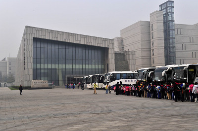 图1 国家动物博物馆门前停满了载着和平里小学师生们的大客车