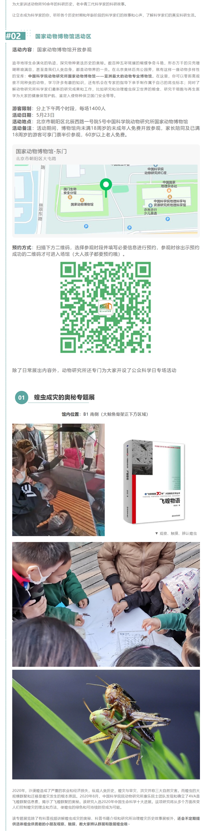 2021年5月,我们迎来了第十七届公众科学日,主题是“百年复兴路 科学正当时”。动物研究所作为中科院里历史最悠久的研究所之一,将会为大家讲述动物所90余年的科研历史,老中青三代科学家的科研故事,提供了与科学家面对面的科普讲座,同时为小朋友们免费开放国家动物博物馆、制作昆虫标本、互动科普游戏和最新的前沿进展展品。