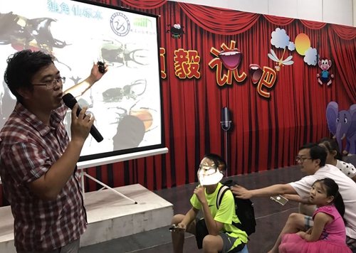 甲虫的外形奇特、色彩艳丽,也比较常见,是小朋友非常感兴趣的一类昆虫。刘晔老师通过漂亮的图片向大家系统的介绍了甲虫的身体结构和常见种类的甲虫。看着威风的独角仙、色彩各异的步甲和锹甲,小朋友们的热情也被调动起来。现场的很多小朋友都参加过之前我馆组织的昆虫标本制作等活动,对于昆虫的分类也是相当专业的。刘老师接下来还介绍了常见的蜻蜓目、螳螂目、膜翅目和双翅目昆虫的特征和习性,他风趣幽默的小故事让现场时不时响起笑声和掌声。
